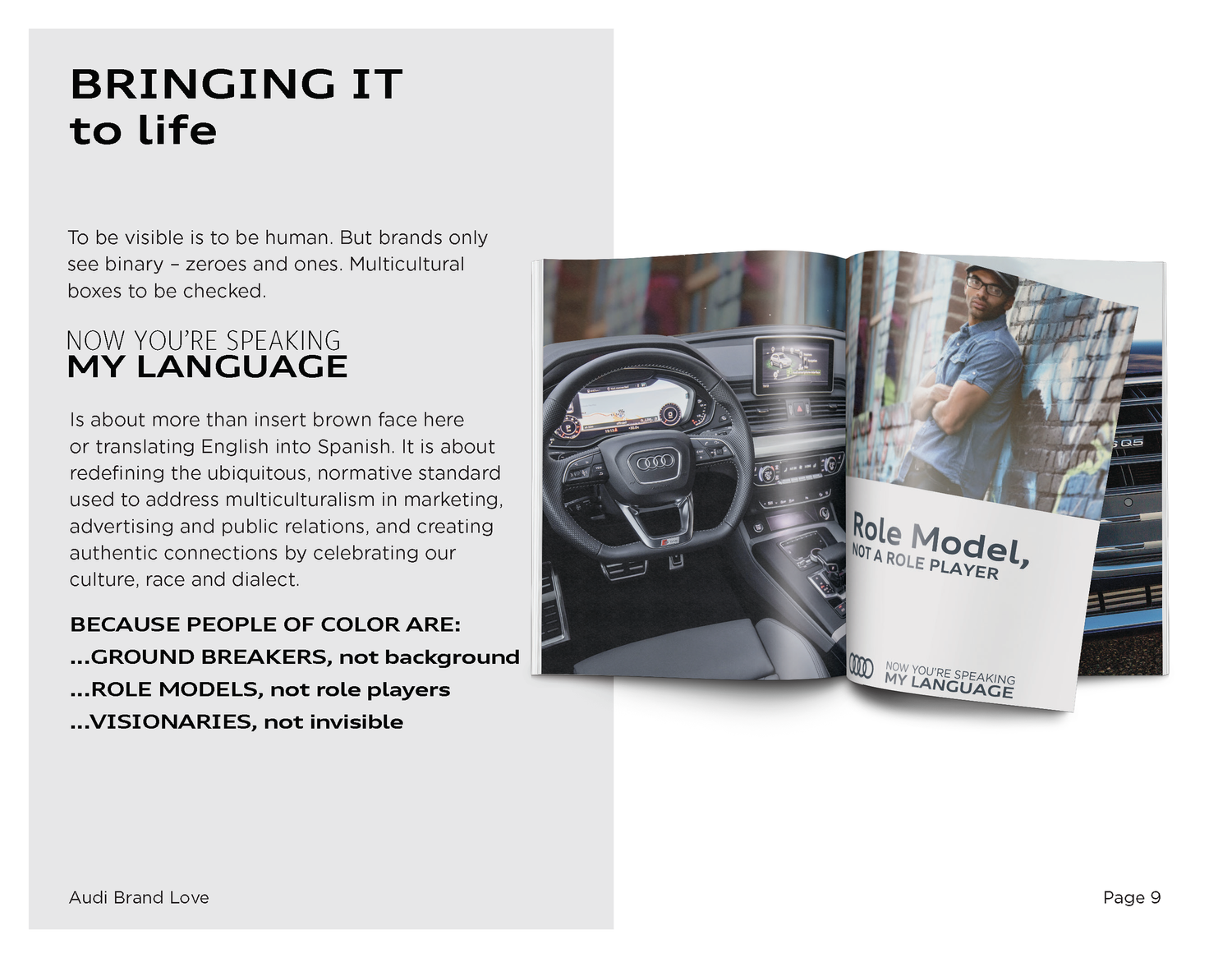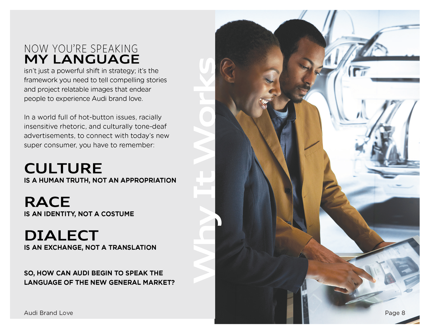 Seventy percent of Black, Latinos and Asians say, “Audi is a brand I love,” but nearly 9 out of 10 don’t feel that love in return. I set out to change that by pitching Audi of America a growth market strategy centered on speaking authentically and directly to diverse consumers.